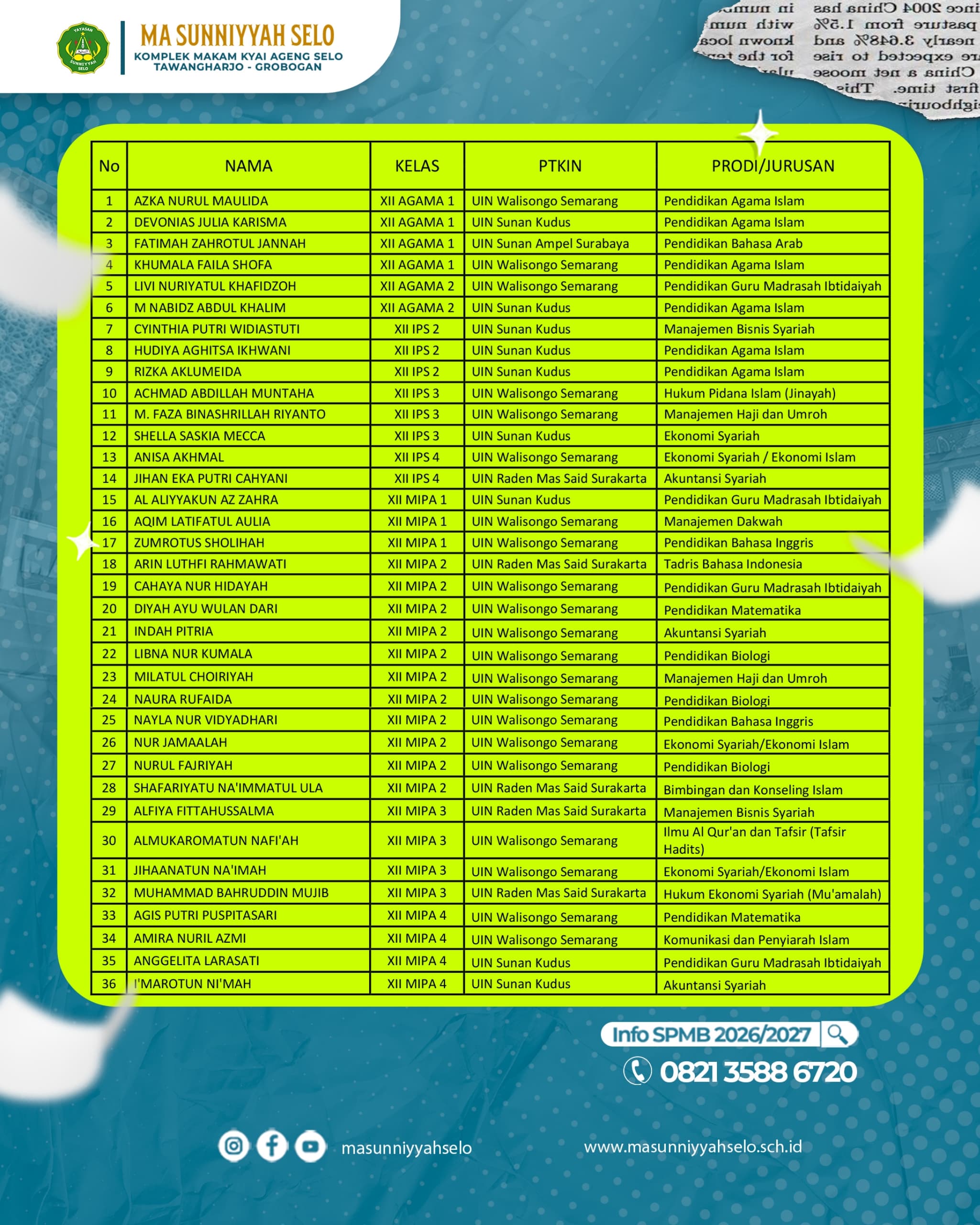 Grobogan — Sebanyak 36 murid MA Sunniyyah Selo berhasil lolos Seleksi Prestasi Akademik Nasional Perguruan Tinggi Keagamaan Islam Negeri (SPAN-PTKIN) tahun 2026. Prestasi ini menjadi kebanggaan bagi madrasah serta bukti kerja keras para siswa dalam menempuh pendidikan selama di bangku sekolah. 🎓